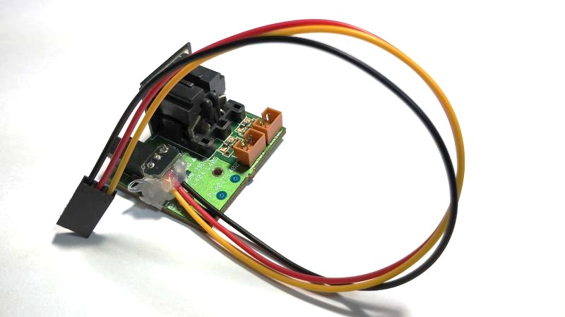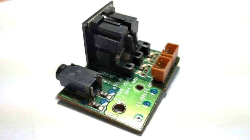 | 2.光トランスミッタ固定 | PHONES端子(3.5mmステレオミニプラグ)の背面に接着剤、ホットボンド等で光トランスミッタを固定します。 光デジタルケーブルにはこのような角型ー丸形ケーブルを使用する想定です。 光軸の調整が必要な場合はテストモードで発光させながらPHONES端子の中心に光トランスミッタの発光部が来るように位置調整するか、SPDIF受信器でデータが受信できるか確認しながら位置調整してください。 PCのオーディオデバイスをSPDIF受信器とし、WaveSpectraなどで確認すると分かりやすいです。 *テストモードはUSBコネクタJ3からの+5V給電でも動作します。ただし、コネクタJ1から入力ケーブルを取り外して実施してください。 | ![]() ![]() |